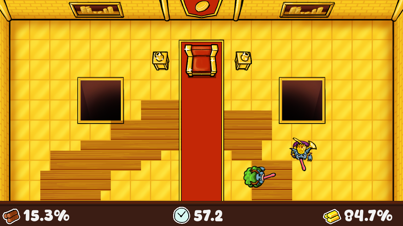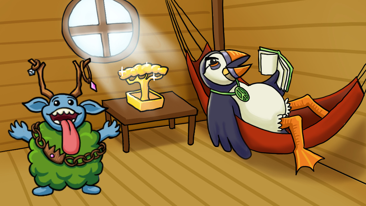 Rezmar WoodTongue is a Skremplet with a Goblic Endowment that allows him to turn gold into wood by licking it. His rival Bruupar ShinyTongue has the inverse power. He can turn wood into gold. Bruupar has been clearing out the surrounding forests in order to get more wood to turn into gold. Rezmar has been enjoying life collecting trinkets, eating wood, and most of all sleeping in his favorite tree house. Until one day Bruupar's lackeys cut down Rezmar's beloved tree. Now Rezmar is on a quest to put a stop to Bruupar's wanton destruction.